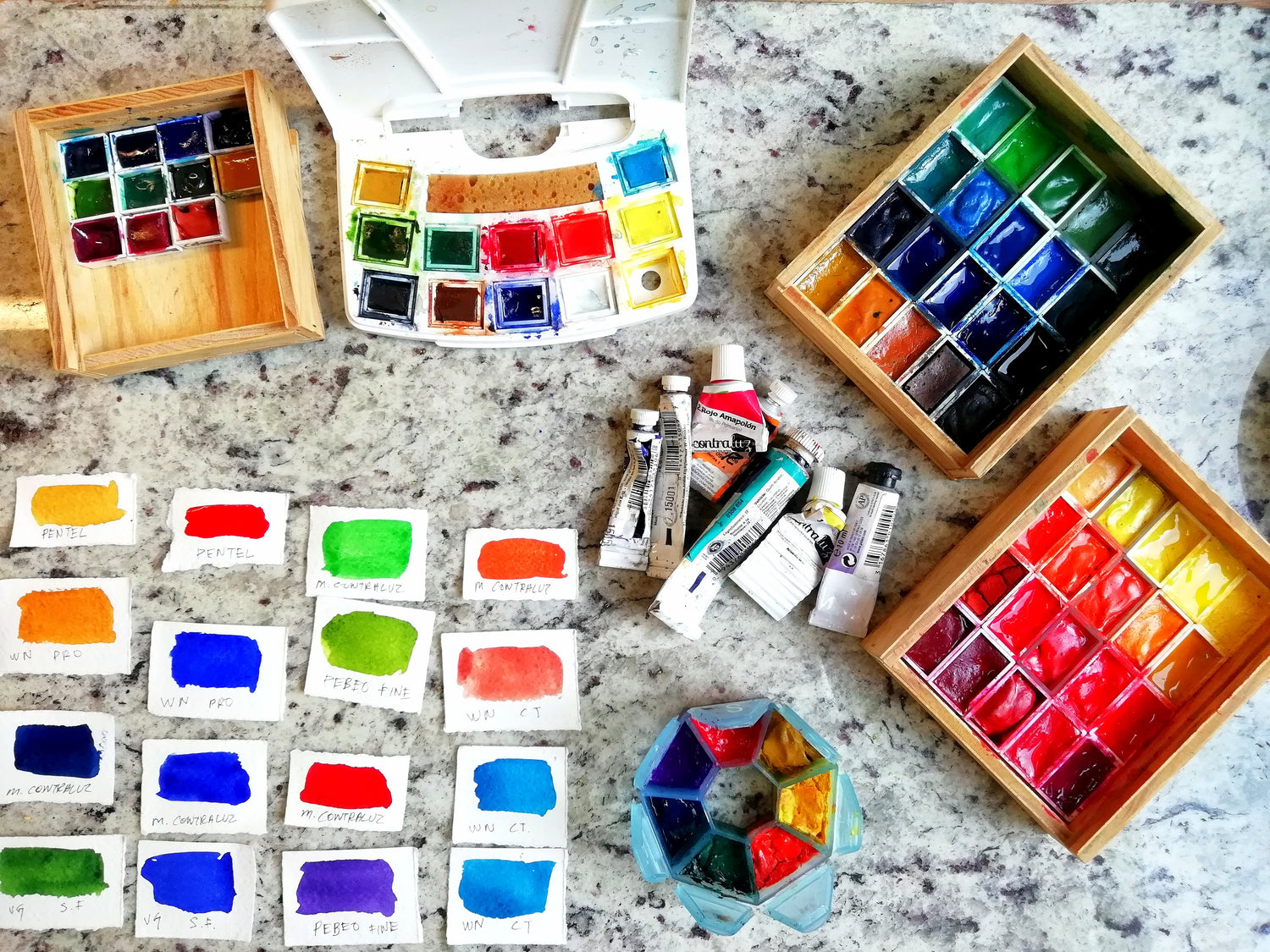 Antes de comenzar, familiarízate con los colores de tu paleta. Prueba cada uno en una hoja de papel para comprender sus propiedades y cómo se mezclan.