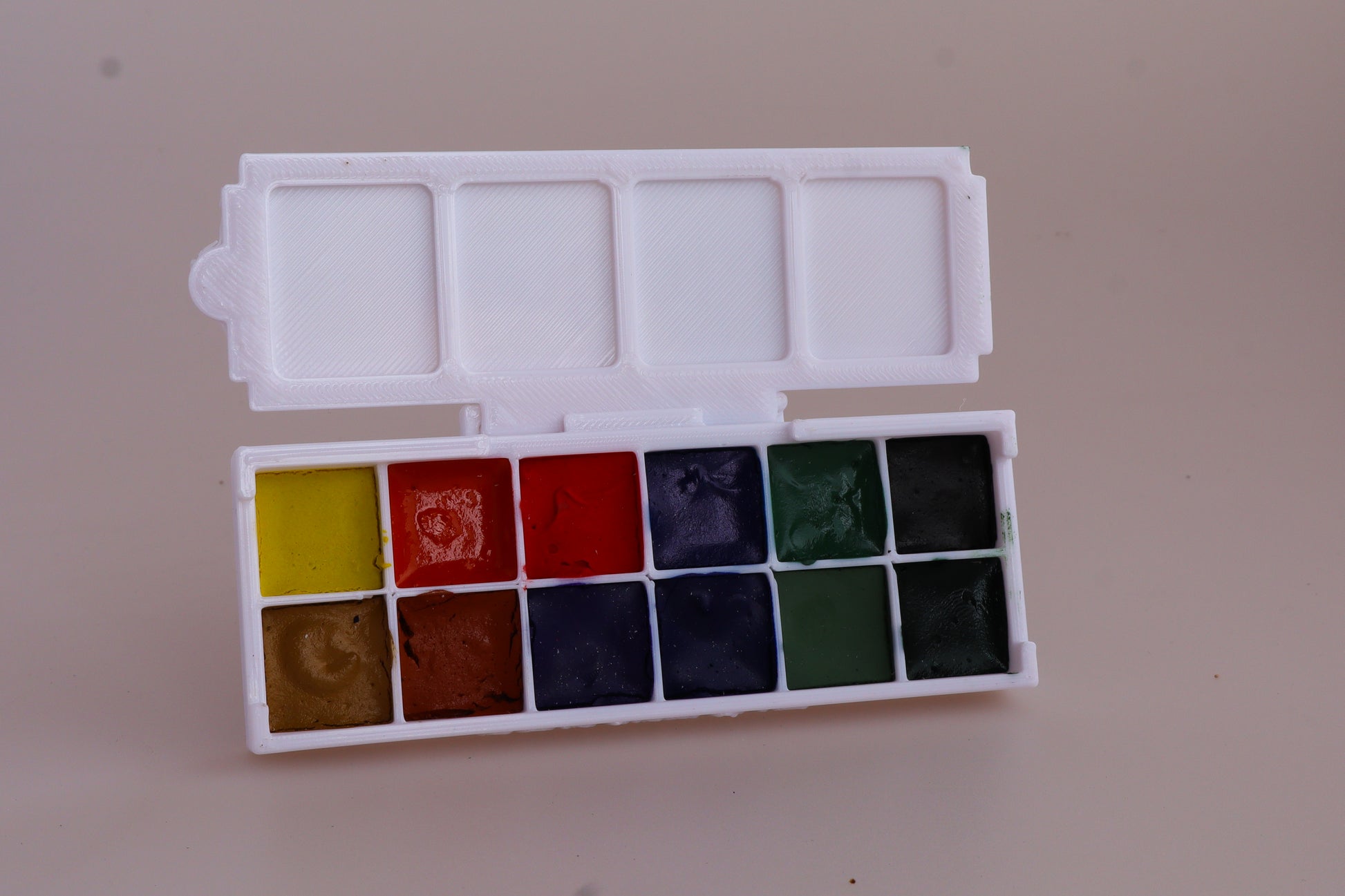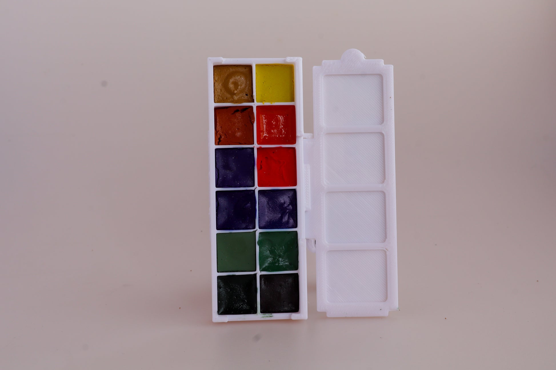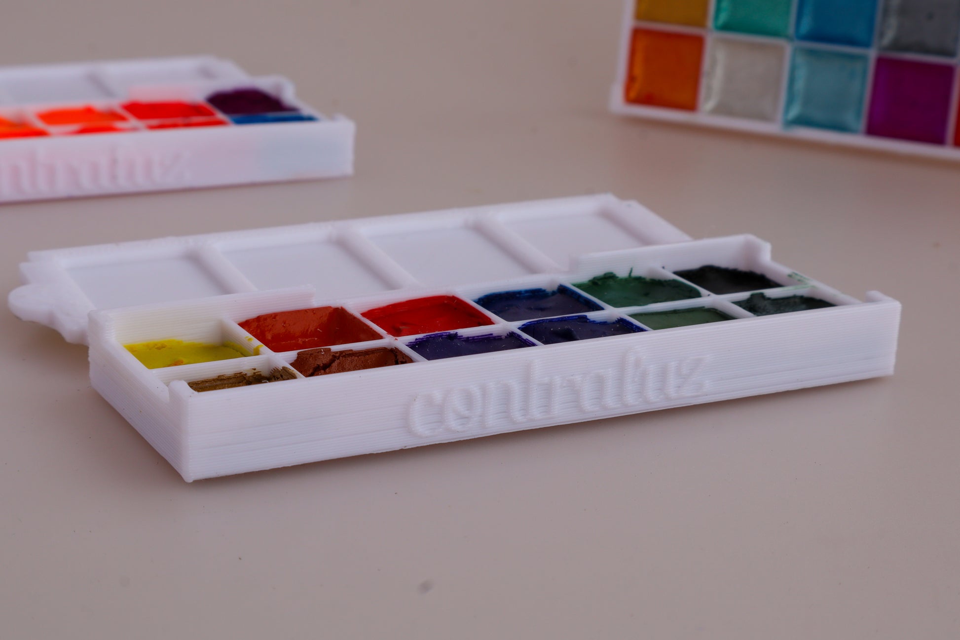 Set de 12 unidades en una bandeja impresa en 3D. Su tapa se convierte en una paleta de mezcla gracias a su sistema de acople. 2ml por cada color.