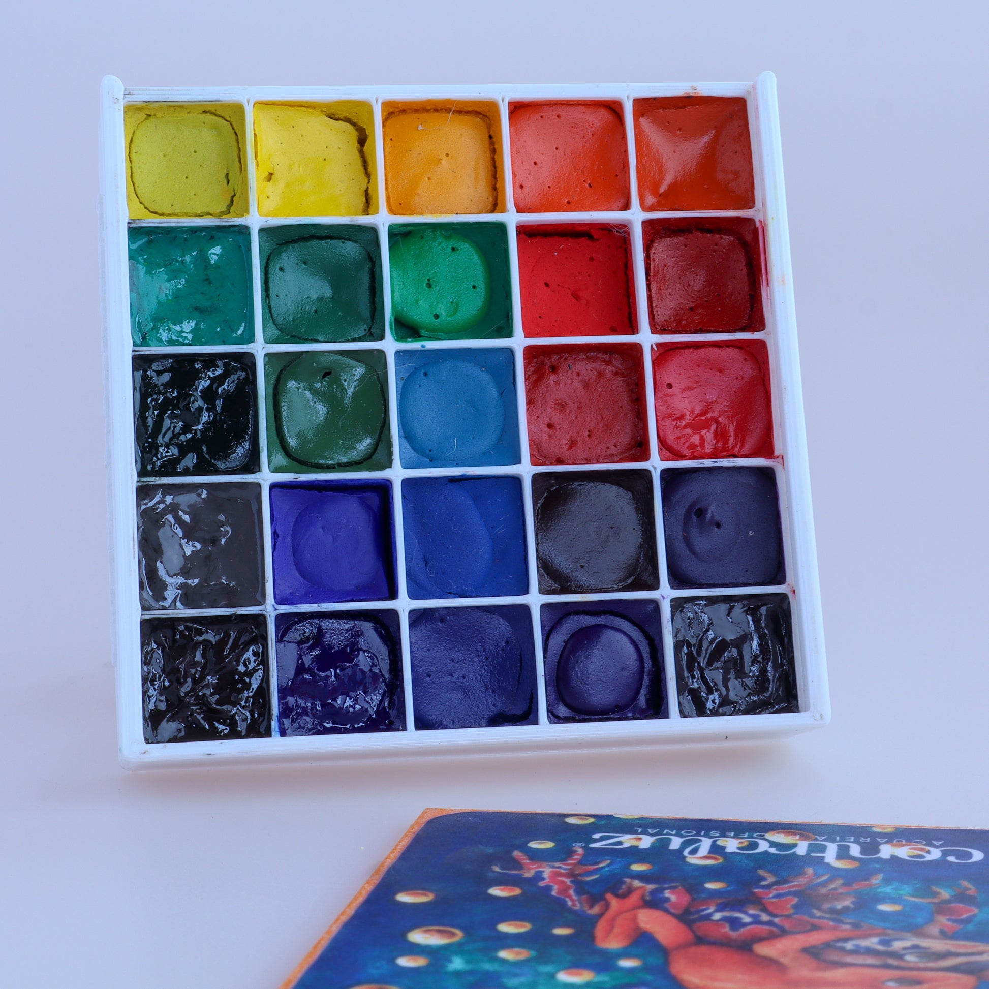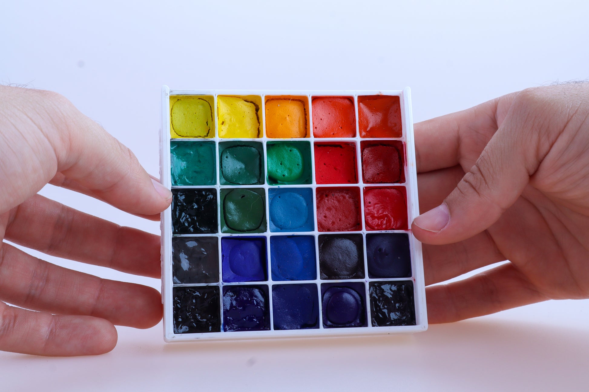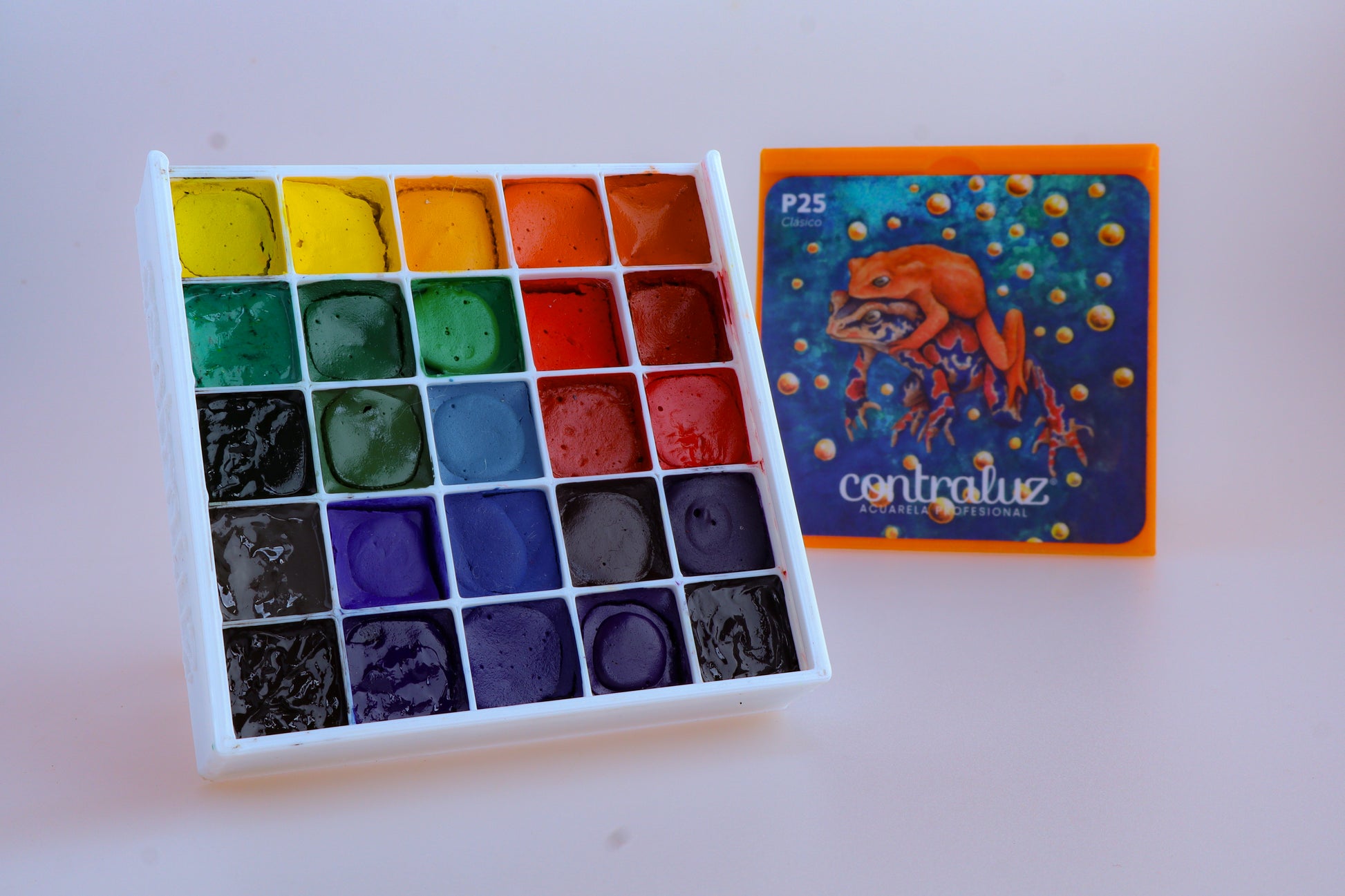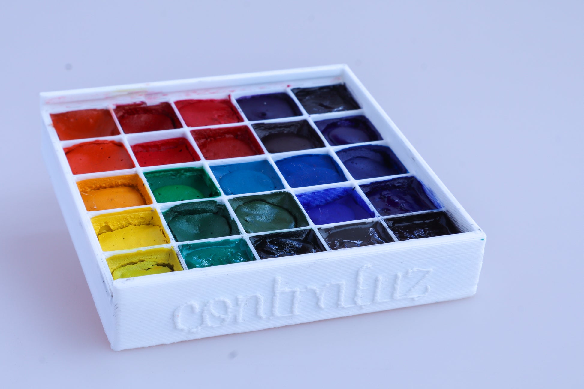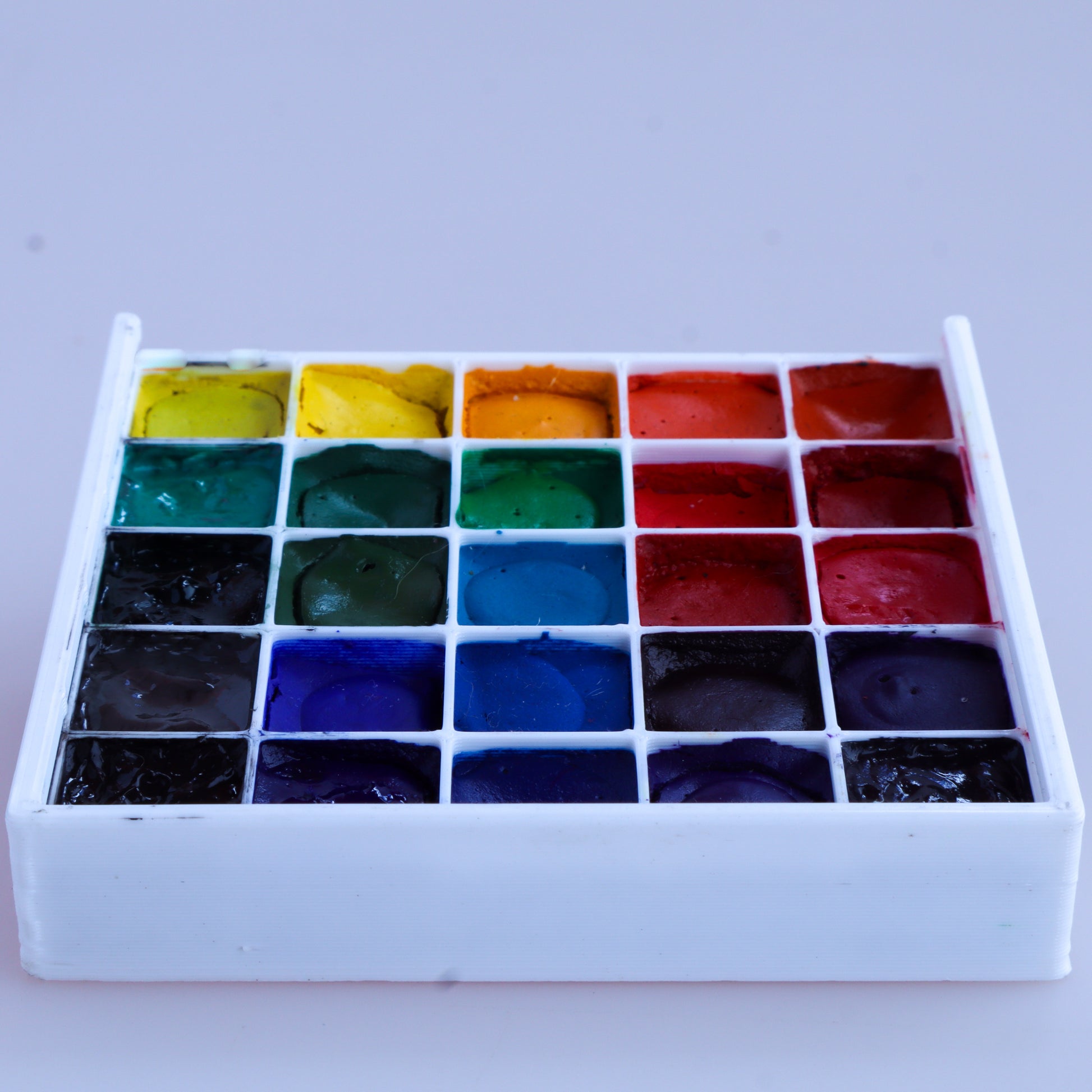 Set de 25 unidades en una bandeja impresa en 3D. Tapa deslizable, 2ml por cada color. Incluye vaso y paleta de mezcla.